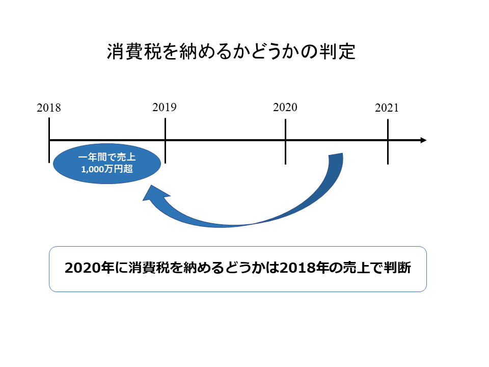 例でいえば、2018年に一年間の売上が1,000万円を超えていますから2020年は納税する事となります。