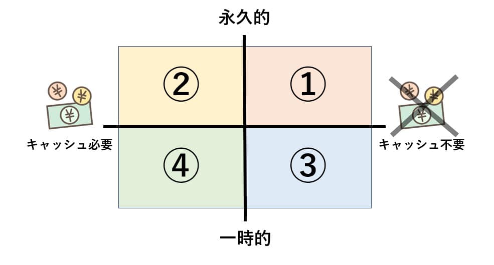 ①の「永久的」+「¥不要」な節税対策がよく、④の「一時的」+「¥必要」な節税対策がダメ、という訳ではありません。各法人の財務状況や経営状態、今後の経営方針によって、どの節税策を優先し、適用するかは違ってくるからです。