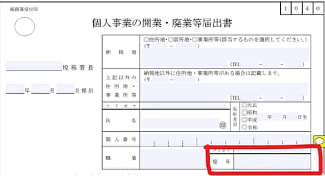 左図のように開業届に屋号を記入するところがありますので、屋号付きの口座開設をしたい場合は決めてから開業届を提出した方がよいでしょう。